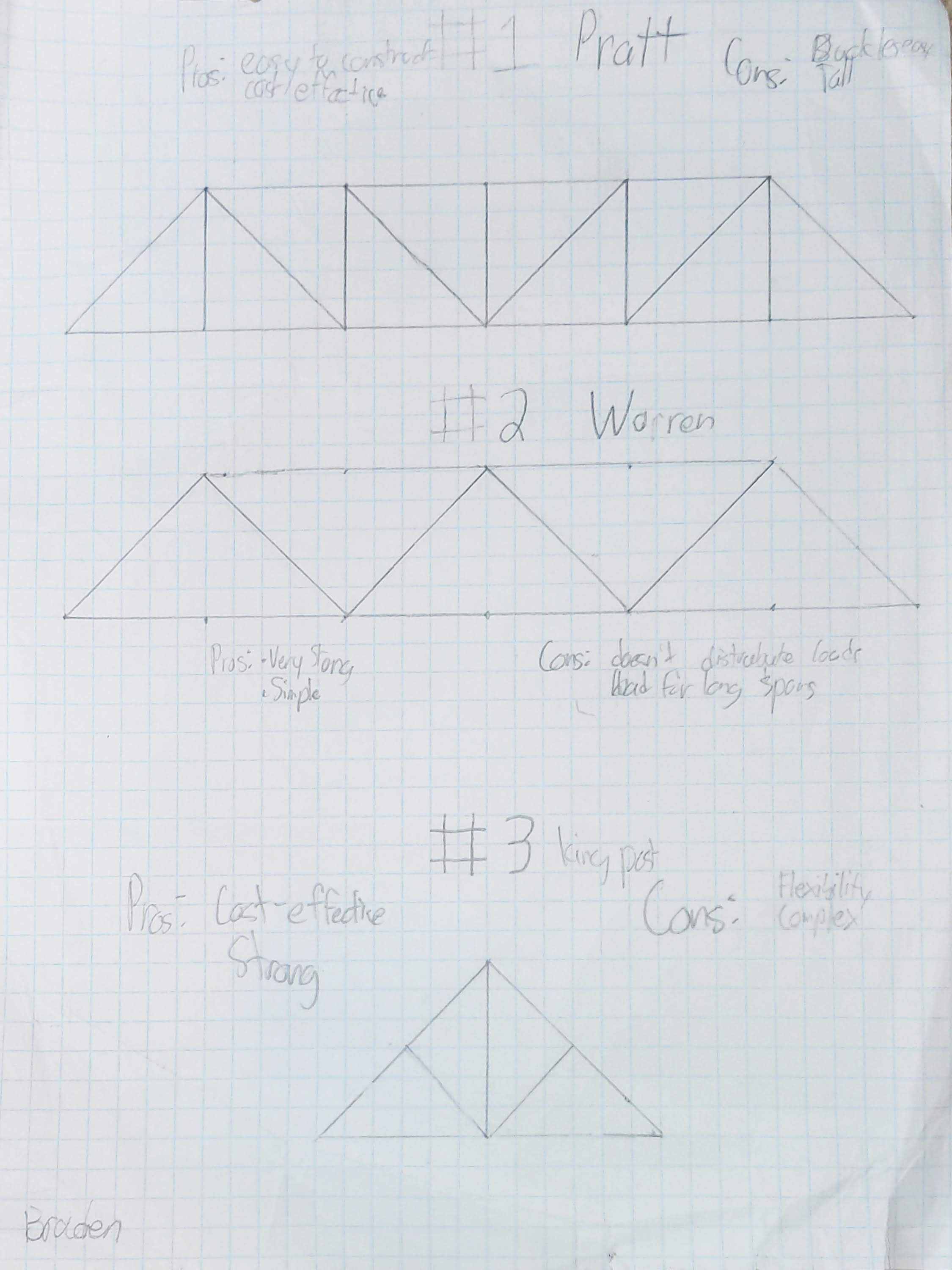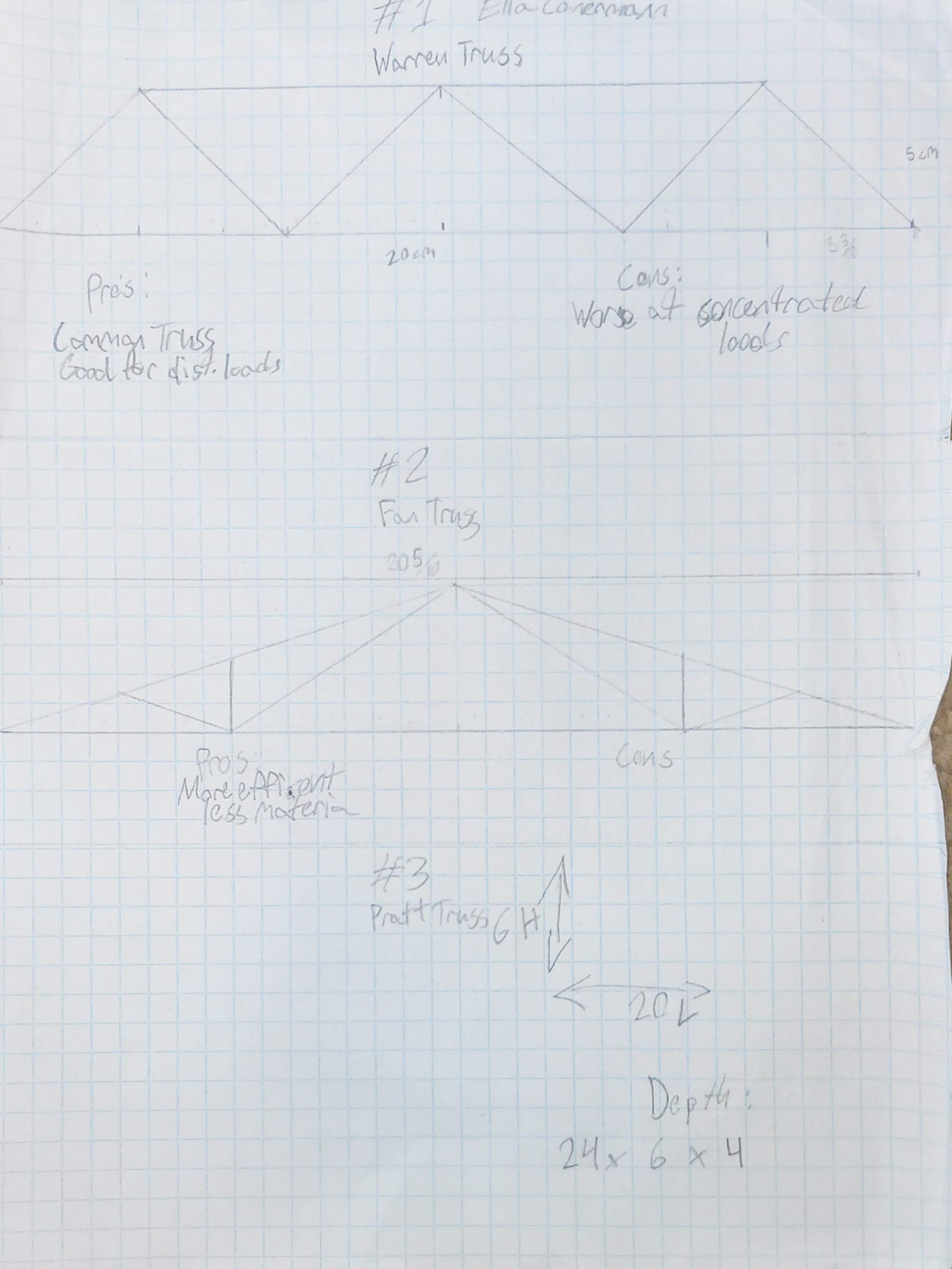 We decided to go with the Fan Truss due to its simplicity, its low amount of resources, its high amount of strength, and friendly weight distribution.