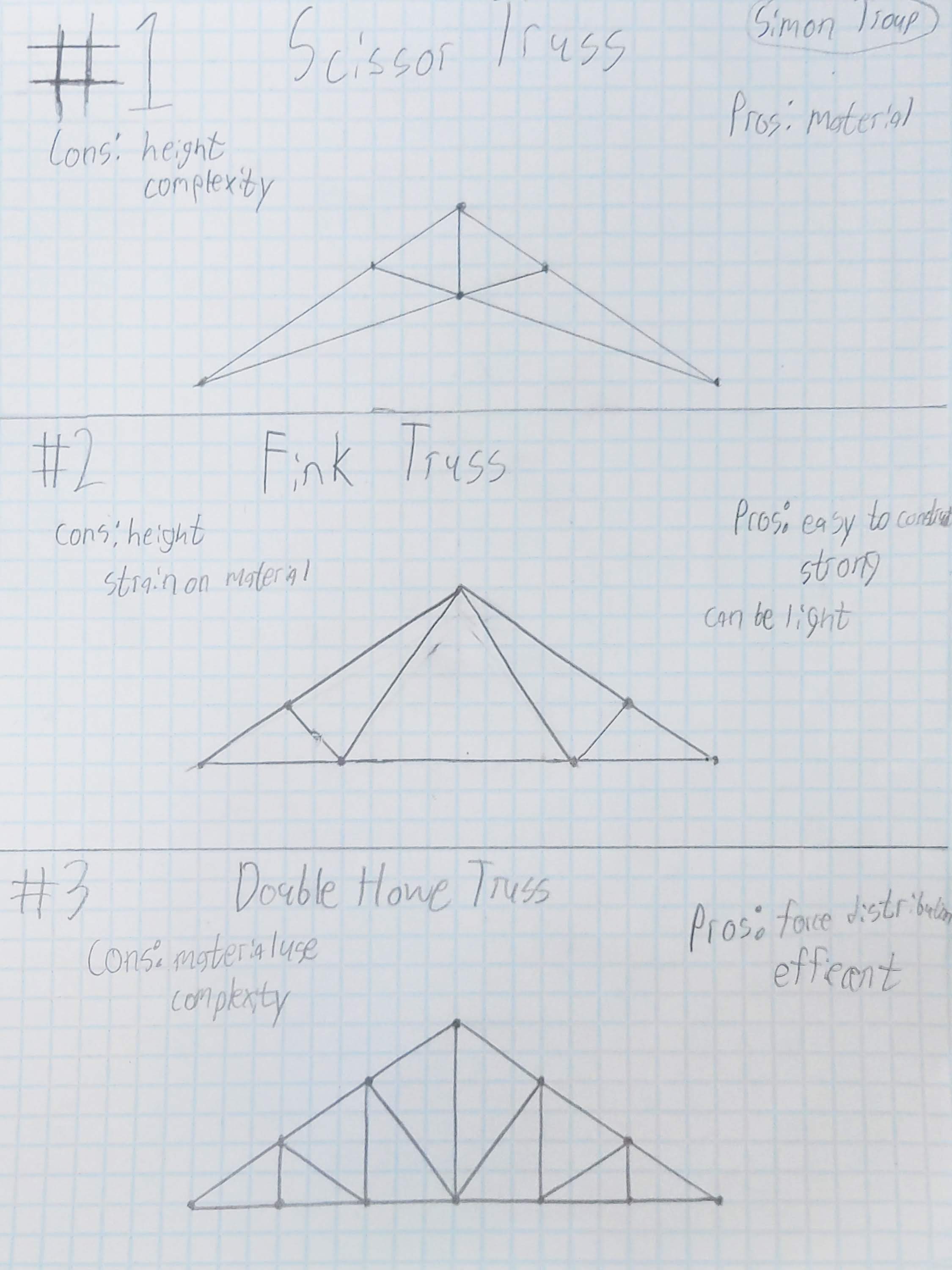 We decided to go with the Fan Truss due to its simplicity, its low amount of resources, its high amount of strength, and friendly weight distribution.